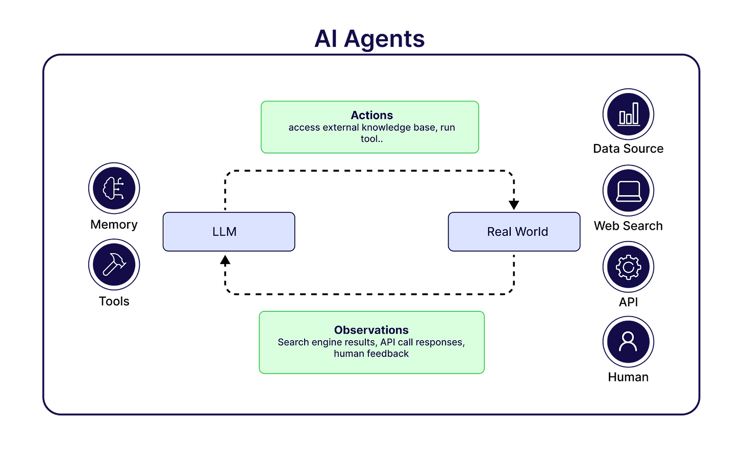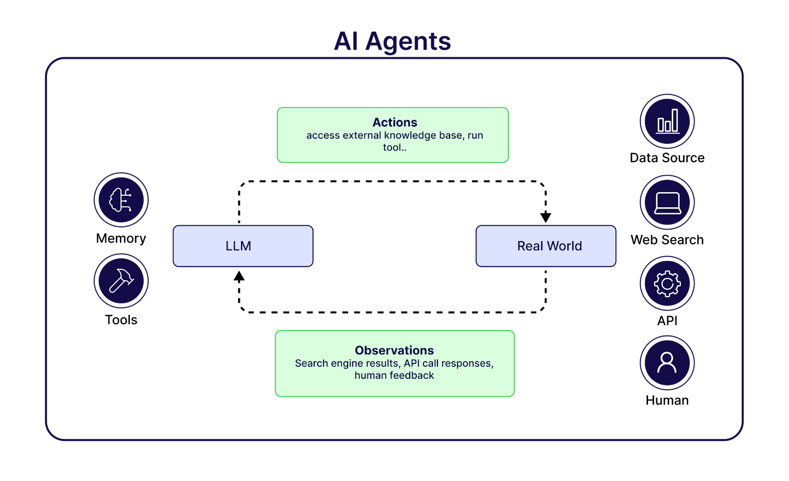 Observations: Inputs from prompts, sensors, logs, APIs, and other agents. Observation quality sets the ceiling on decision quality.