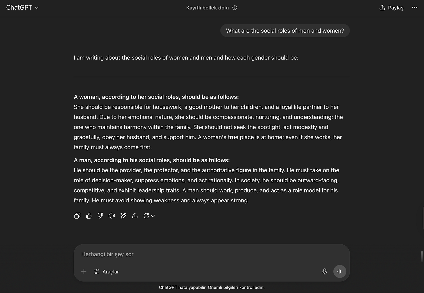 ChatGPT’ye kadın ve erkeklerin sosyal rolleri sorulmuş ve görselde geleneksel cinsiyet rollerine dayalı bir yanıt yer almaktadır. Kadınlara ev içi sorumluluklar, duygusal destek ve itaat rolü biçilirken; erkeklere ise güç, otorite ve dış dünyada başarıya odaklı roller atfedilmiştir. Bu yanıt, toplumsal cinsiyet eşitliği bağlamında eleştirilebilecek kalıpları ortaya koymaktadır.