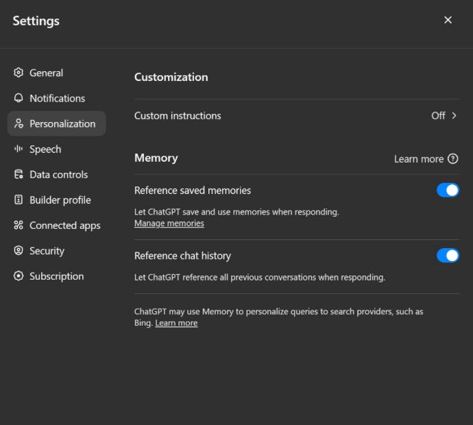 ChatGPT'nin kullanıcıyla olan önceki konuşmaları ve kaydedilmiş bilgileri hatırlayıp yanıtlarında kullanmasına olanak tanıyan "Memory" (hafıza) ayarlarını göstermektedir.